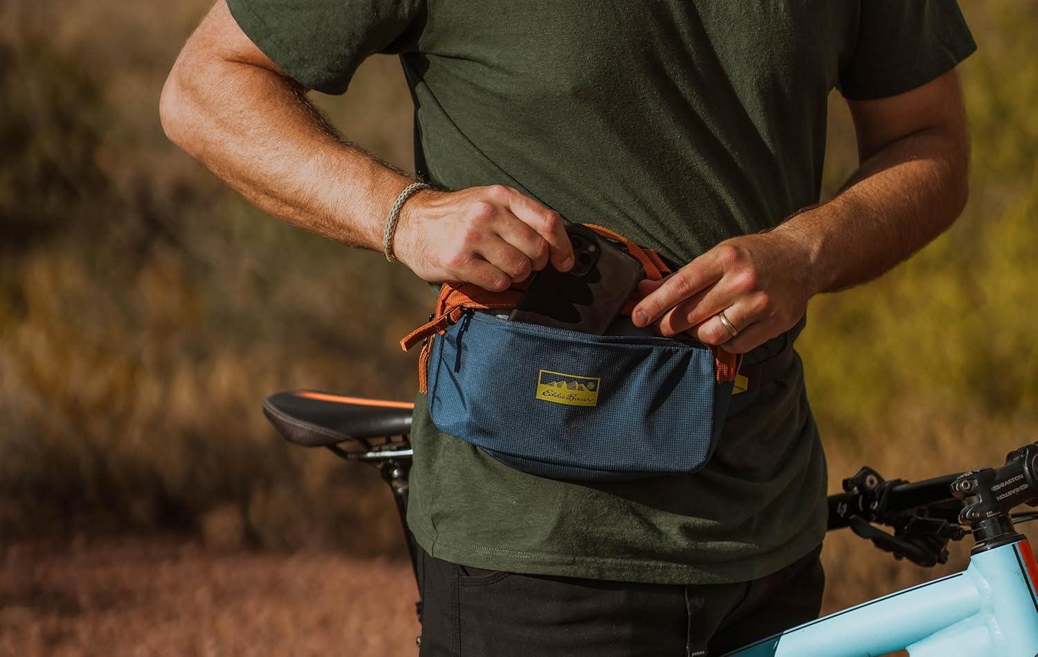 The Eddie Bauer 3L Field Pack, a compact yet highly functional accessory designed for urban adventures and beyond. This versatile pack is tailored for efficiency and organization, making it an essential companion for those on the move. Grab and go with the convenient top handles, or utilize the adjustable waistband with buckle closure for a secure and comfortable fit, expanding up to 56″ max length. With one main compartment, one exterior pocket, and two interior pockets, it offers ample storage space for your belongings. Two interior stretch mesh pockets and a key leash offer additional storage for quick and easy access to gear, while a hidden front zipper pocket keeps valuables secure. Crafted from 100% recycled materials and featuring a water-repellent finish, this field pack reflects our commitment to sustainability and durability. Specially designed to fit securely against the waist when packed, this field pack is ideal for those on the go – whether it's trail running, mountain biking, or your daily commute.