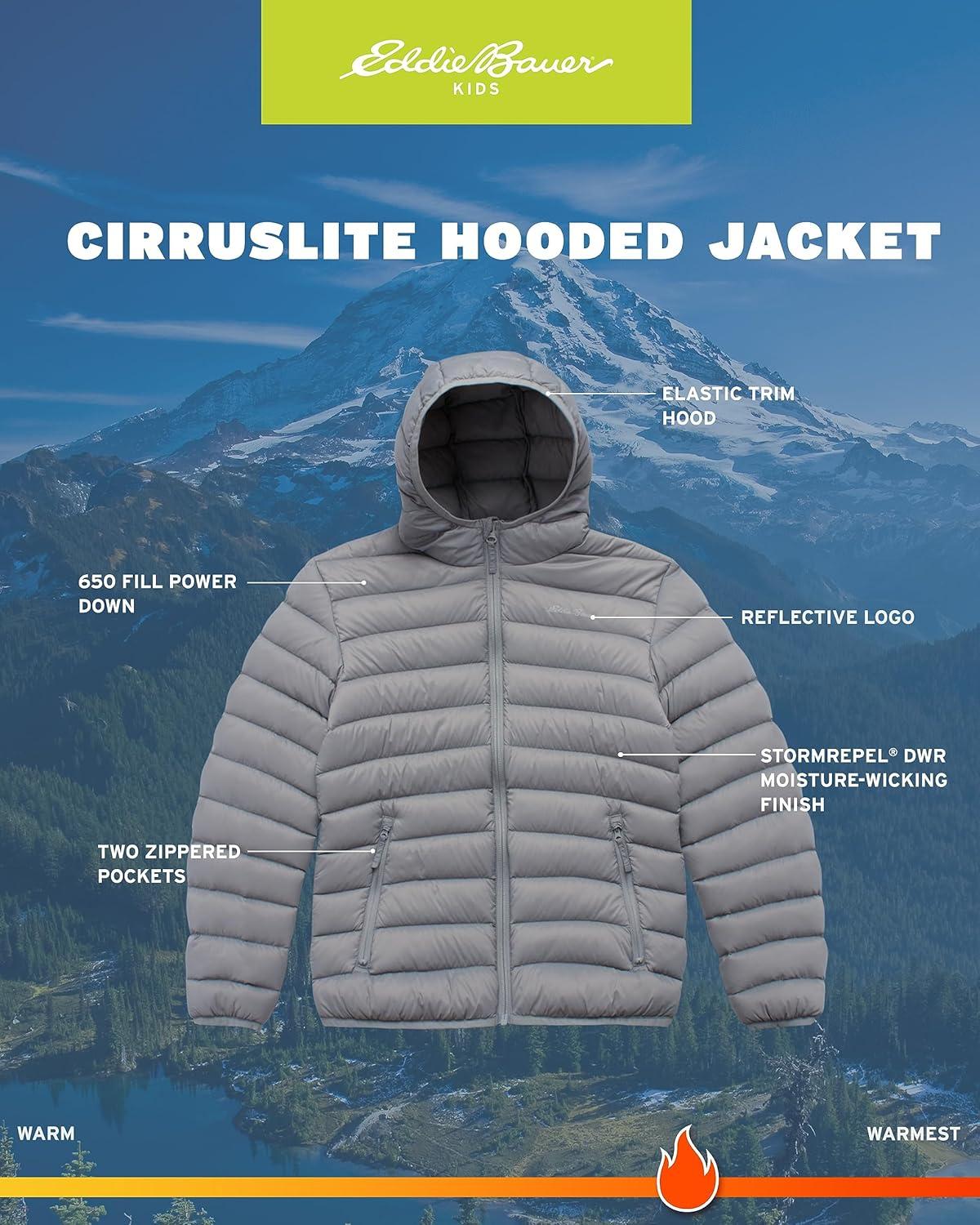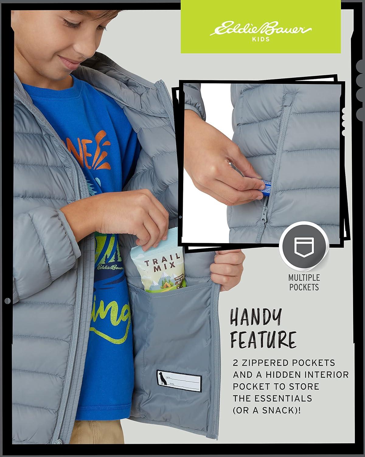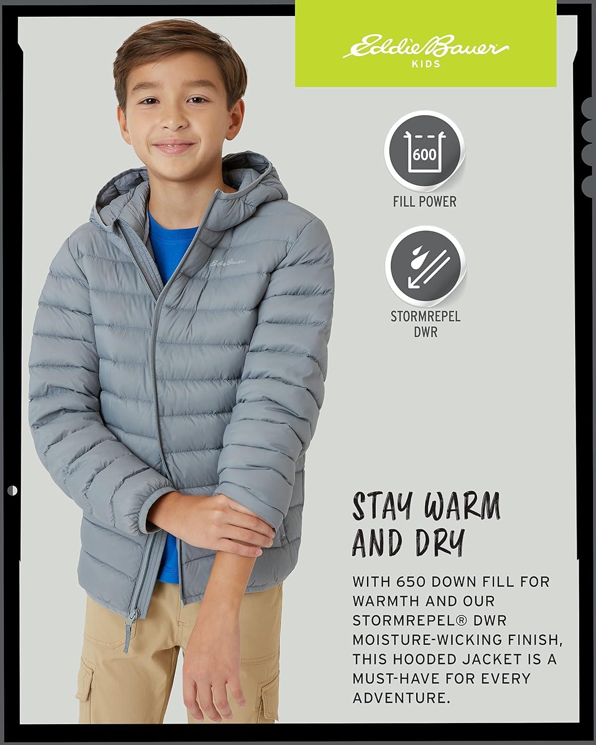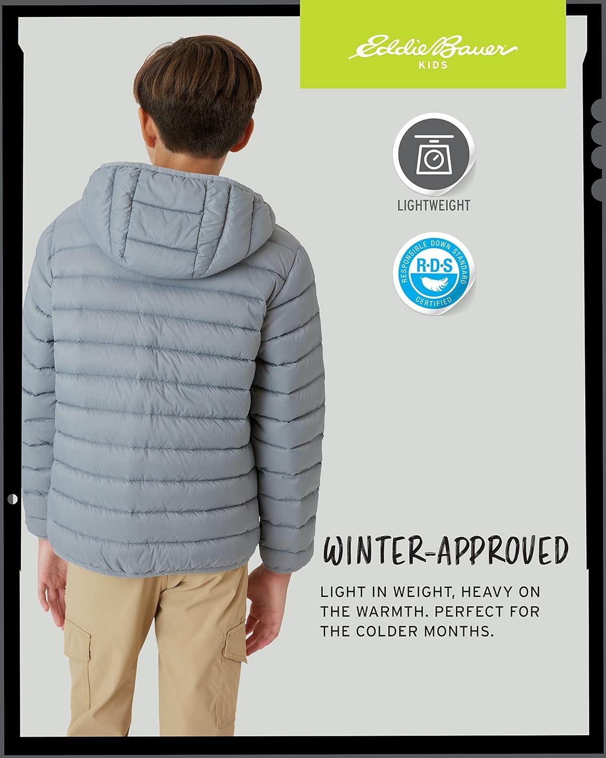 Get your boy ready for any weather with this officially licensed Eddie Bauer puffer jacket. Designed with adventure in mind, this insulated and quilted bubble jacket is built to last. It's made from high-quality, durable materials that will hold up through years of cold-weather wear and is super soft for maximum comfort. With a variety of classic colors to choose from, this jacket is a perfect gift for any boy in your life. This windbreaker is engineered with StormRepel technology, a durable, water-repellent finish that makes moisture bead up and roll right off the fabric. This means your child will stay dry and comfortable whether he's playing in the snow or just walking to school on a rainy day. Plus, the lightweight design is perfect for both intense outdoor activities and casual daily wear. Stay warm without the extra bulk. This jacket features premium 650 fill power down insulation that is responsibly sourced and certified by the Responsible Down Standard (RDS). This provides incredible warmth and makes the coat incredibly lightweight, allowing for a full range of motion. Please keep in mind that these jackets run small, so we suggest ordering a size up for a roomier, more comfortable fit.