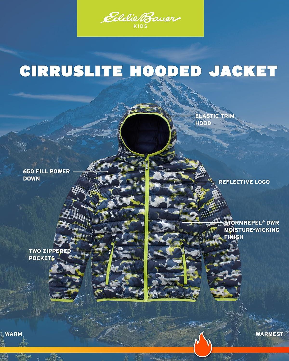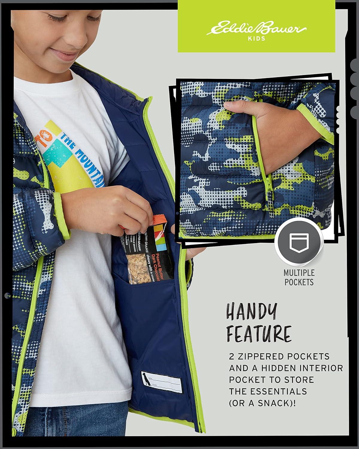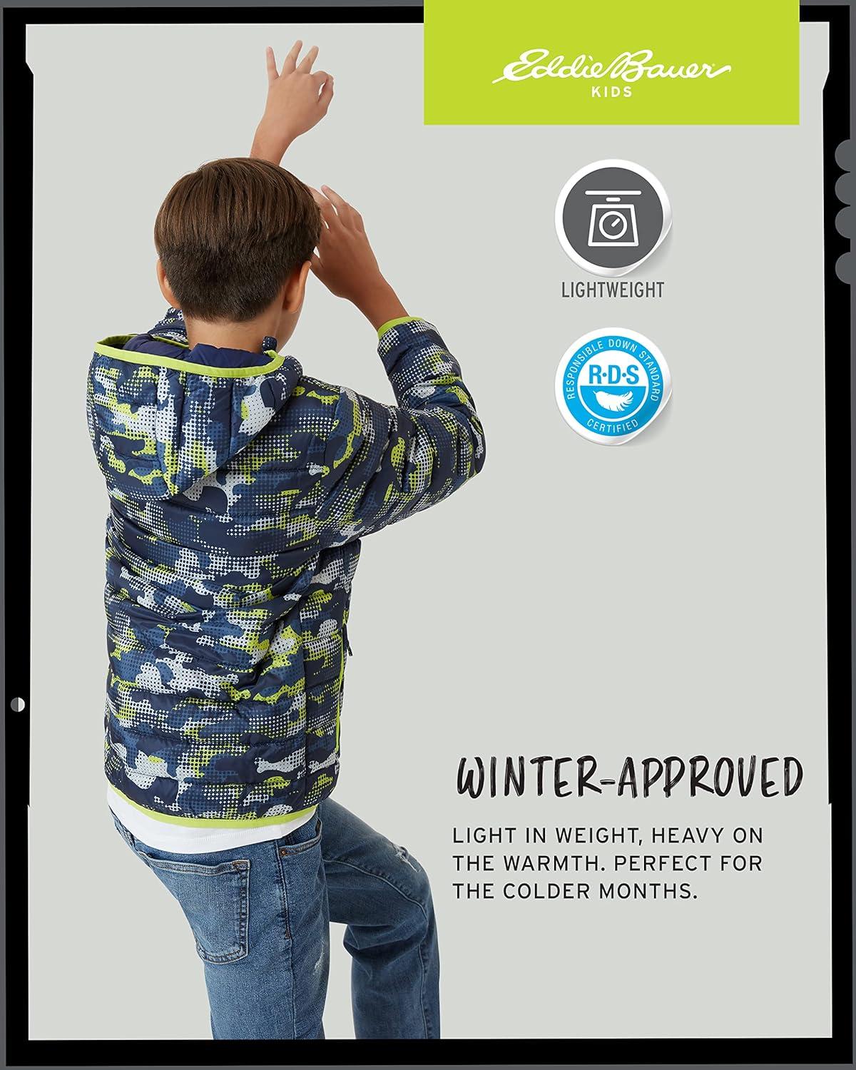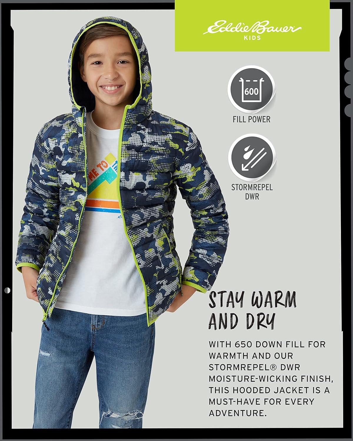 Get your boy ready for any weather with this officially licensed Eddie Bauer puffer jacket. Designed with adventure in mind, this insulated and quilted bubble jacket is built to last. It's made from high-quality, durable materials that will hold up through years of cold-weather wear and is super soft for maximum comfort. With a variety of classic colors to choose from, this jacket is a perfect gift for any boy in your life. This windbreaker is engineered with StormRepel technology, a durable, water-repellent finish that makes moisture bead up and roll right off the fabric. This means your child will stay dry and comfortable whether he's playing in the snow or just walking to school on a rainy day. Plus, the lightweight design is perfect for both intense outdoor activities and casual daily wear. Stay warm without the extra bulk. This jacket features premium 650 fill power down insulation that is responsibly sourced and certified by the Responsible Down Standard (RDS). This provides incredible warmth and makes the coat incredibly lightweight, allowing for a full range of motion. Please keep in mind that these jackets run small, so we suggest ordering a size up for a roomier, more comfortable fit.