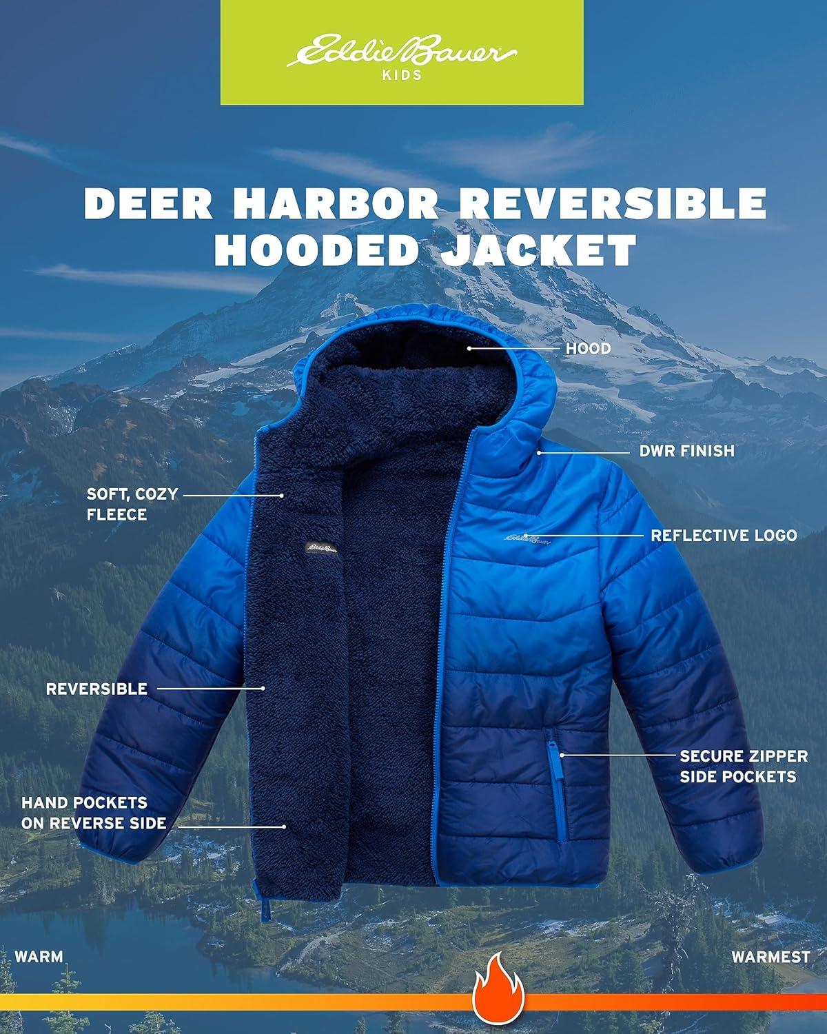 Eddie Bauer Boys’ Reversible Jacket – Waterproof Lightweight Fleece Lined Hooded Puffer Coat – Boys Outerwear Jacket (5-20)(Dark Waters)