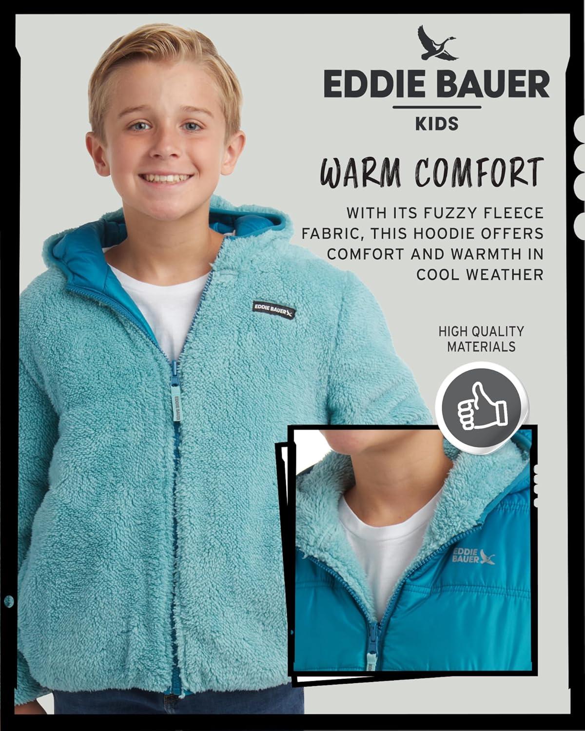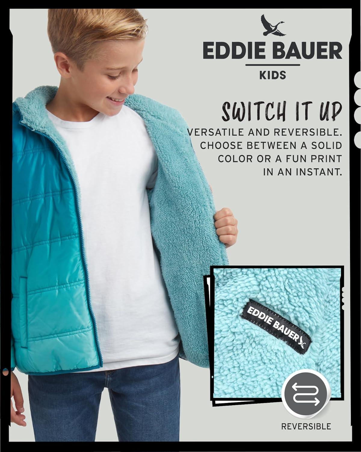 Keep your little boy warm and stylish with this officially licensed Eddie Bauer reversible puffer jacket. This versatile coat is a must-have for any active toddler, offering two great looks in one. One side features a sleek, quilted puffer for a classic look, while the other side is a cozy, soft fleece sherpa that adds a touch of warmth and comfort. With a variety of fashionable colors to choose from, you can easily match this jacket to your child's unique style. This jacket is built to protect against the elements. The StormRepel finish ensures that moisture beads up and rolls right off the fabric, keeping him dry during unexpected rain or snow. Despite its excellent protection, this coat provides warmth without being bulky, making it perfect for both casual wear and winter activities. Deep hip pockets are also included to keep his hands warm and his small treasures secure. For over a century, Eddie Bauer has been a leader in outdoor innovation, and this jacket shows their commitment to both performance and sustainability. The brand uses methods and materials that minimize environmental impact, all while building an outdoor culture that is welcoming to everyone. With a variety of sizes and colors, this jacket makes a perfect and practical gift for any boy in your life.