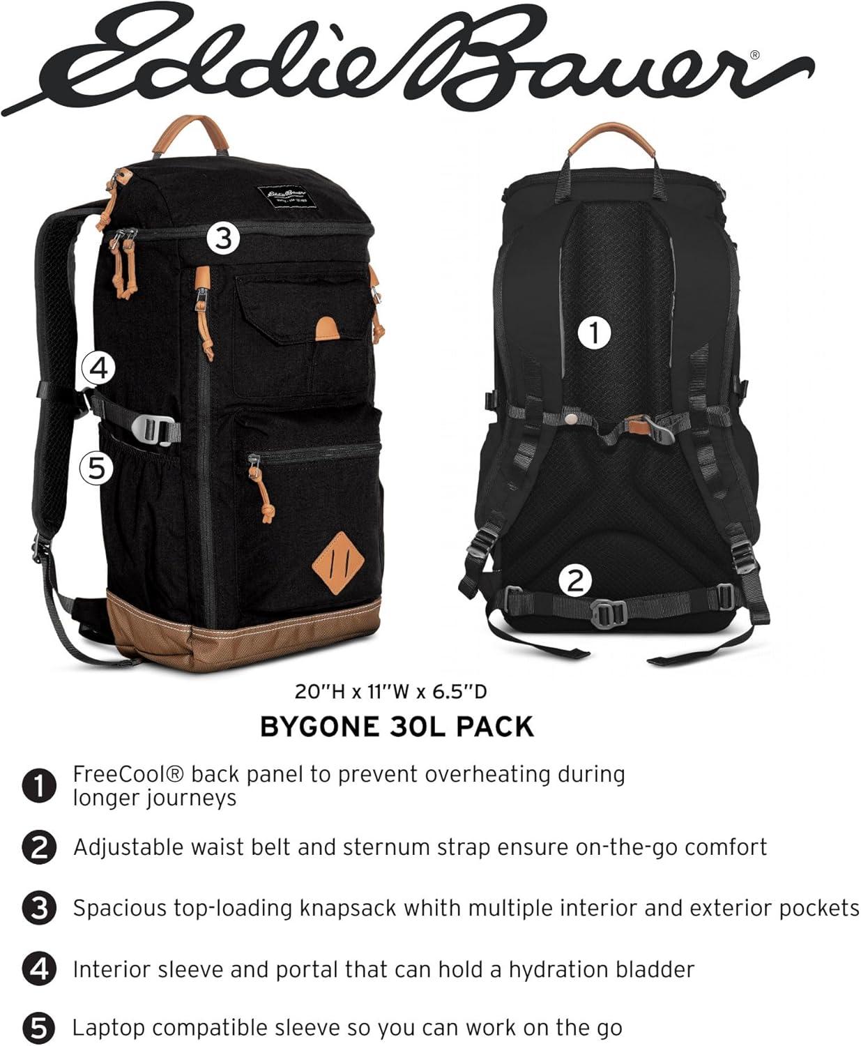 Elevate your everyday carry with the Eddie Bauer Bygone 25L Backpack, where timeless retro design meets modern functionality. Crafted with a durable nylon/polyester body and a ballistic polyester bottom, this backpack is built to withstand the demands of work commutes, travel, or outdoor adventures. The top-loading main compartment offers plenty of space for your daily essentials, while twin side pockets provide quick access to water bottles or small items. A padded laptop-compatible sleeve ensures your tech stays safe, making this bag a reliable companion whether you're heading to the office, or trail. The secure lid fastens with metal latches, adding both style and security to your gear. Designed for unisex use, its compact yet spacious design and adjustable straps offer all-day comfort for users of any height. With a blend of classic aesthetics and rugged durability, the Eddie Bauer Bygone 25L Backpack is your go-to solution for organized storage and reliable performance, no matter where your journey takes you. Product Dimensions: 19″” x 12″” x 6″” Capacity: 25L