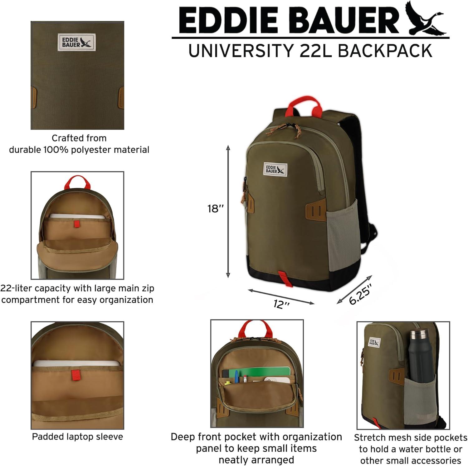 The Eddie Bauer Campus Backpack (26L) is the perfect companion for s, professionals, and travelers, offering spacious storage, smart organization, and all-day comfort. Featuring a large main compartment and a rear padded laptop compartment, this backpack ensures secure and convenient storage for your essentials. The front zippered stash pocket and padded phone pocket provide additional organization for small accessories like keys, chargers, and sunglasses. Two stretch mesh side pockets allow for quick access to water bottles or other on-the-go necessities. Designed with a breathable mesh back panel and ergonomic shoulder straps, this backpack delivers superior comfort for daily commutes, days, or weekend adventures. Crafted from durable polyester, the Eddie Bauer Campus Backpack 26L is built to last while keeping your essentials protected and accessible. Product Dimensions: 18.5”H x 12”W x 7.5”D