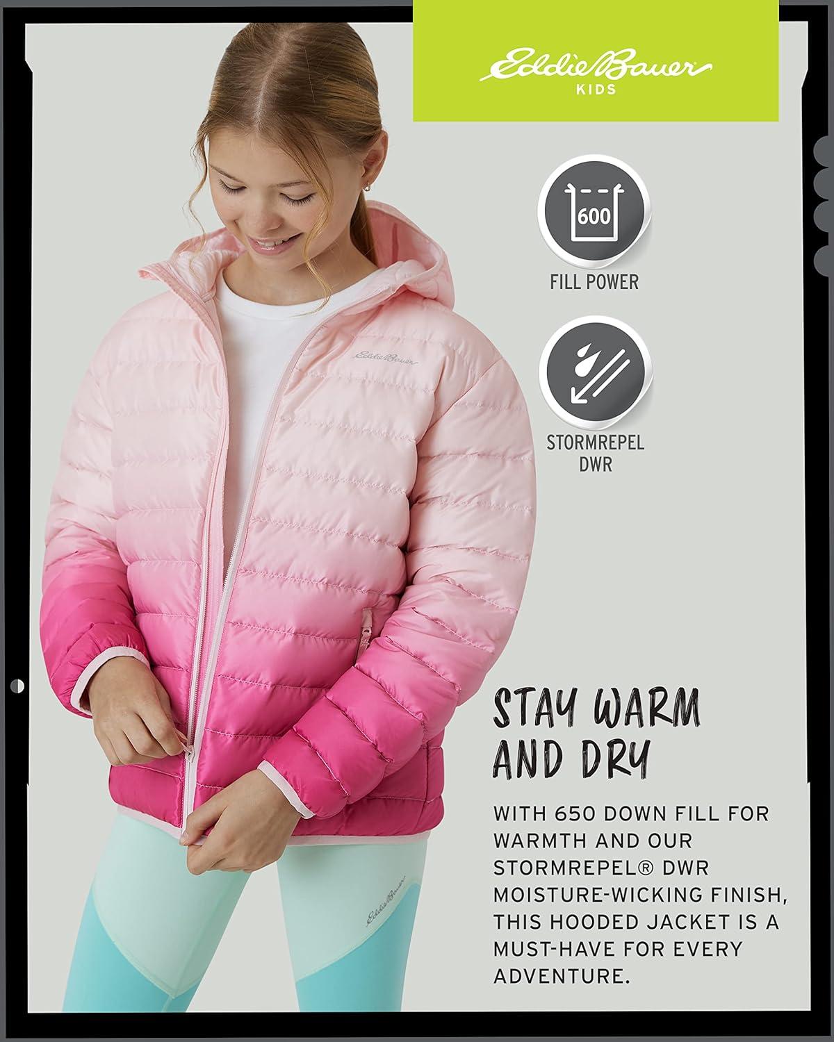 Bundle up your little one in this officially licensed Eddie Bauer girls' puffer jacket. Built for adventure, this high-quality coat is designed to keep her warm and cozy all winter long. With a super-soft feel and premium materials, it's a durable choice that will hold up through countless snow days and outdoor activities. This stylish jacket is available in a variety of classic colors, so you can choose the perfect one to match her unique style. Stay dry and comfortable no matter the weather. This insulated jacket is treated with a StormRepel finish, which causes moisture to bead on the surface and roll right off, preventing the fabric from soaking through. The 650 fill power down is Responsible Down Standard Certified, offering superior warmth without the bulk. Perfect for everything from winter sports to a casual day at school, this puffer jacket combines a fashionable look with great functionality. The comfort fit and lightweight design make this jacket a great choice for any girl. It comes in a variety of sizes to ensure a perfect fit, along with classic colors like blue, grey, red, and black. Whether for your daughter, granddaughter, or niece, this warm and durable puffer jacket makes for an excellent gift that she'll appreciate all season long.