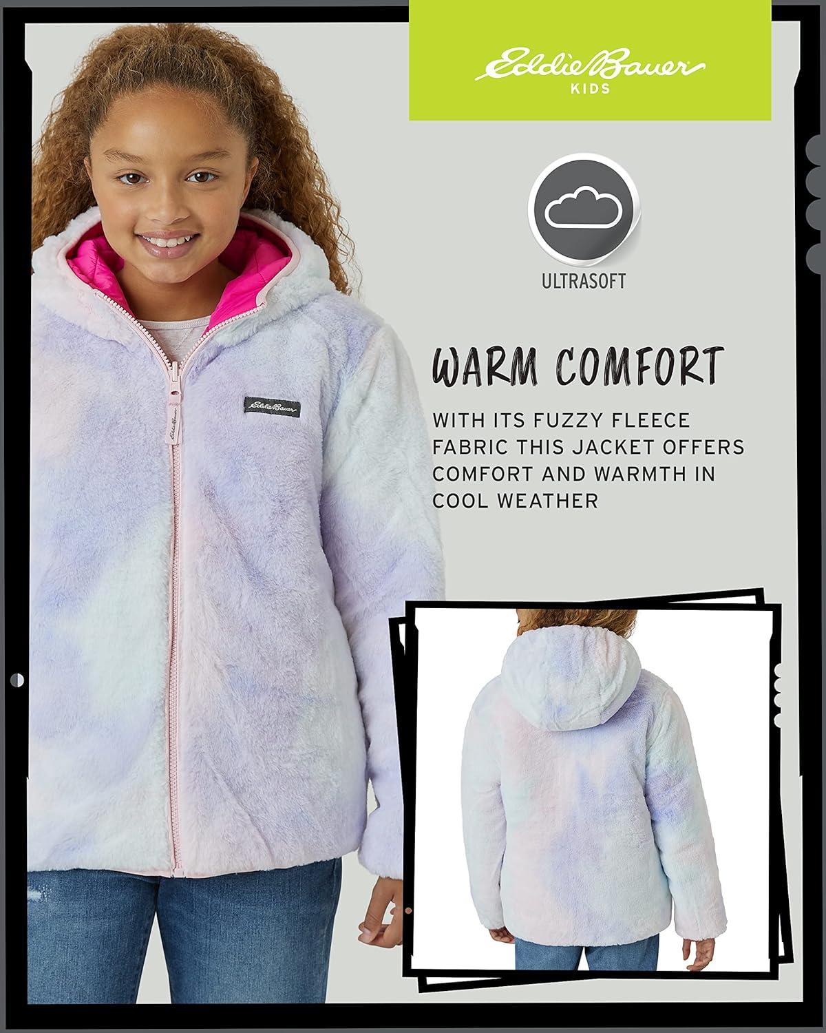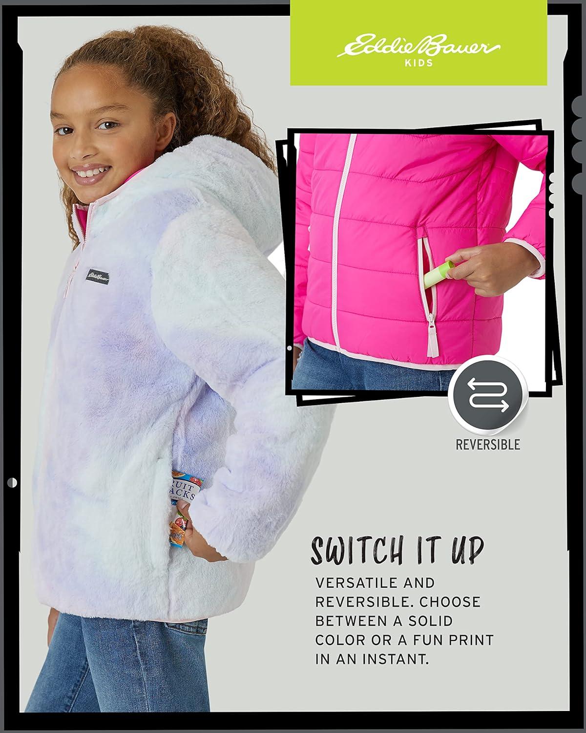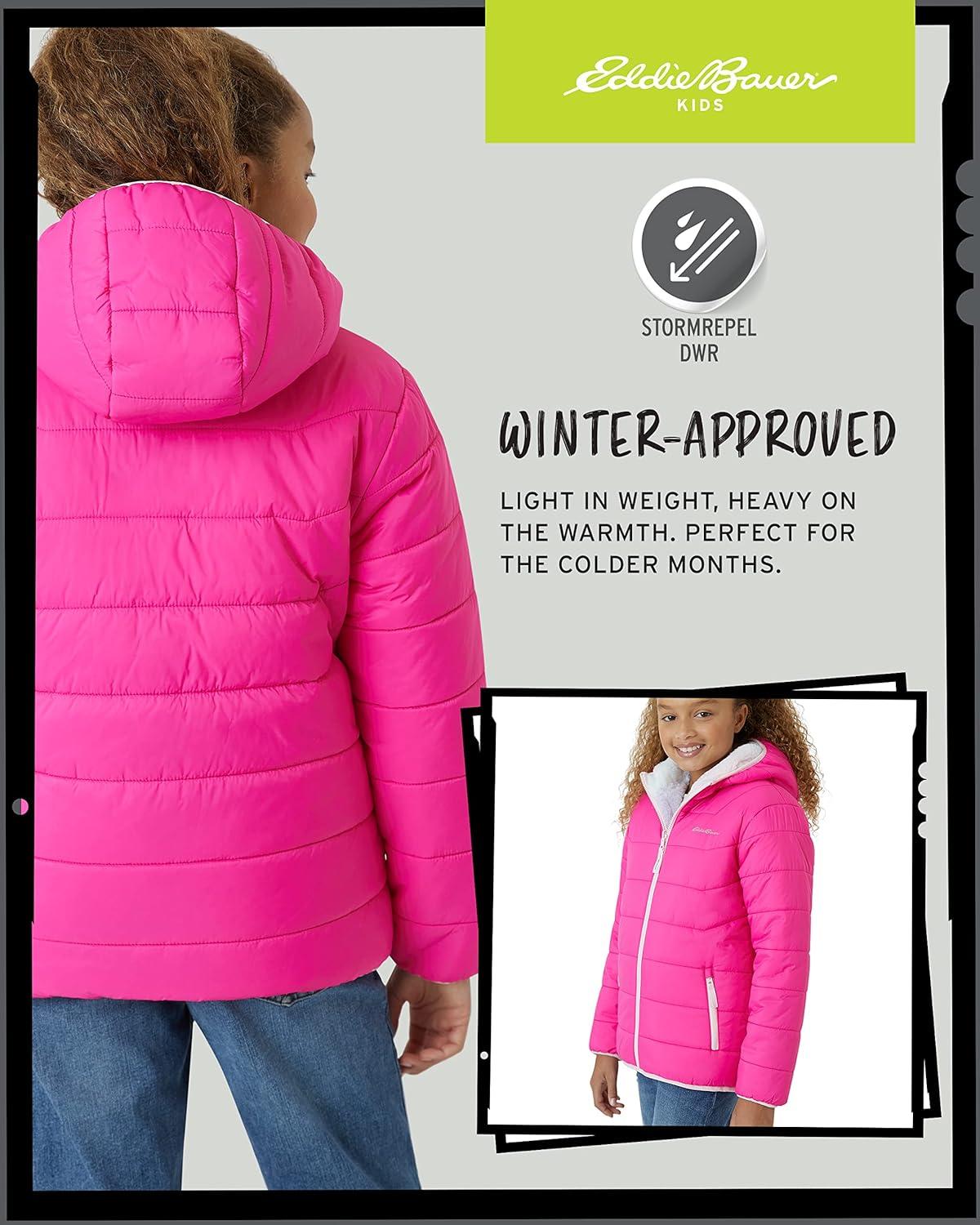 Get your little girl ready for any weather with this officially licensed Eddie Bauer reversible puffer jacket. This versatile coat is a must-have for any stylish girl, offering two great looks in one. One side features a sleek, quilted puffer for a classic look, while the other side is a cozy, soft sherpa fleece that adds a touch of warmth and comfort. With a variety of fashionable colors to choose from, you can easily match this jacket to your child's unique style. This jacket is built to protect against the elements. The StormRepel finish ensures that moisture beads up and rolls right off the fabric, keeping her dry during unexpected rain or snow. Despite its excellent protection, this coat provides warmth without being bulky, making it perfect for both casual wear and winter activities. Deep hip pockets are also included to keep her hands warm and her small treasures secure. For over a century, Eddie Bauer has been a leader in outdoor innovation, and this jacket shows their commitment to both performance and sustainability. The brand uses methods and materials that minimize environmental impact, all while building an outdoor culture that is welcoming to everyone. With a variety of sizes and colors, this jacket makes a perfect and practical gift for any girl in your life.