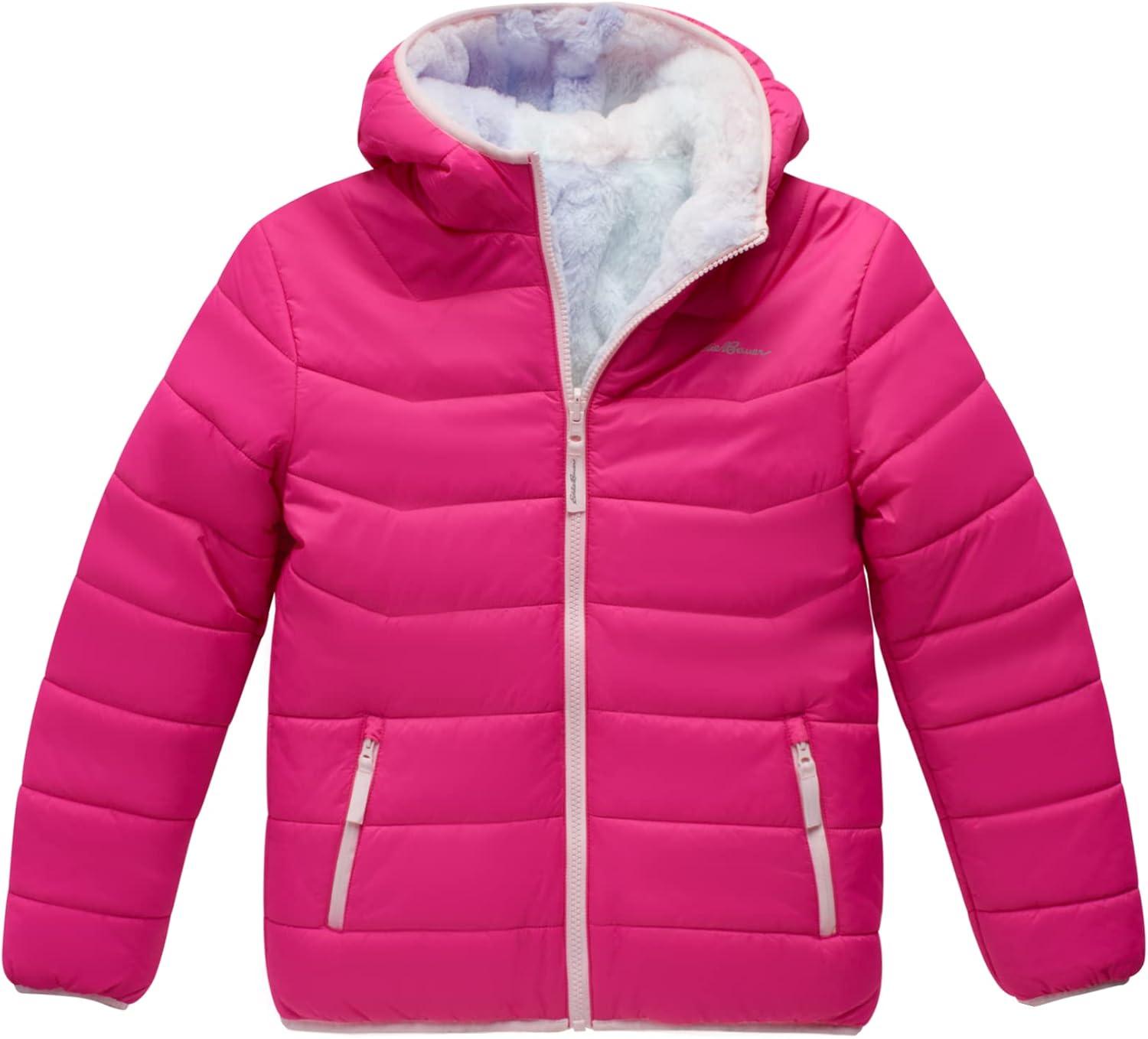 Eddie Bauer Girls’ Reversible Jacket – Deer Harbor Waterproof Lightweight Puffer Coat with Faux Shearling Lining (5-20)(Magenta)
