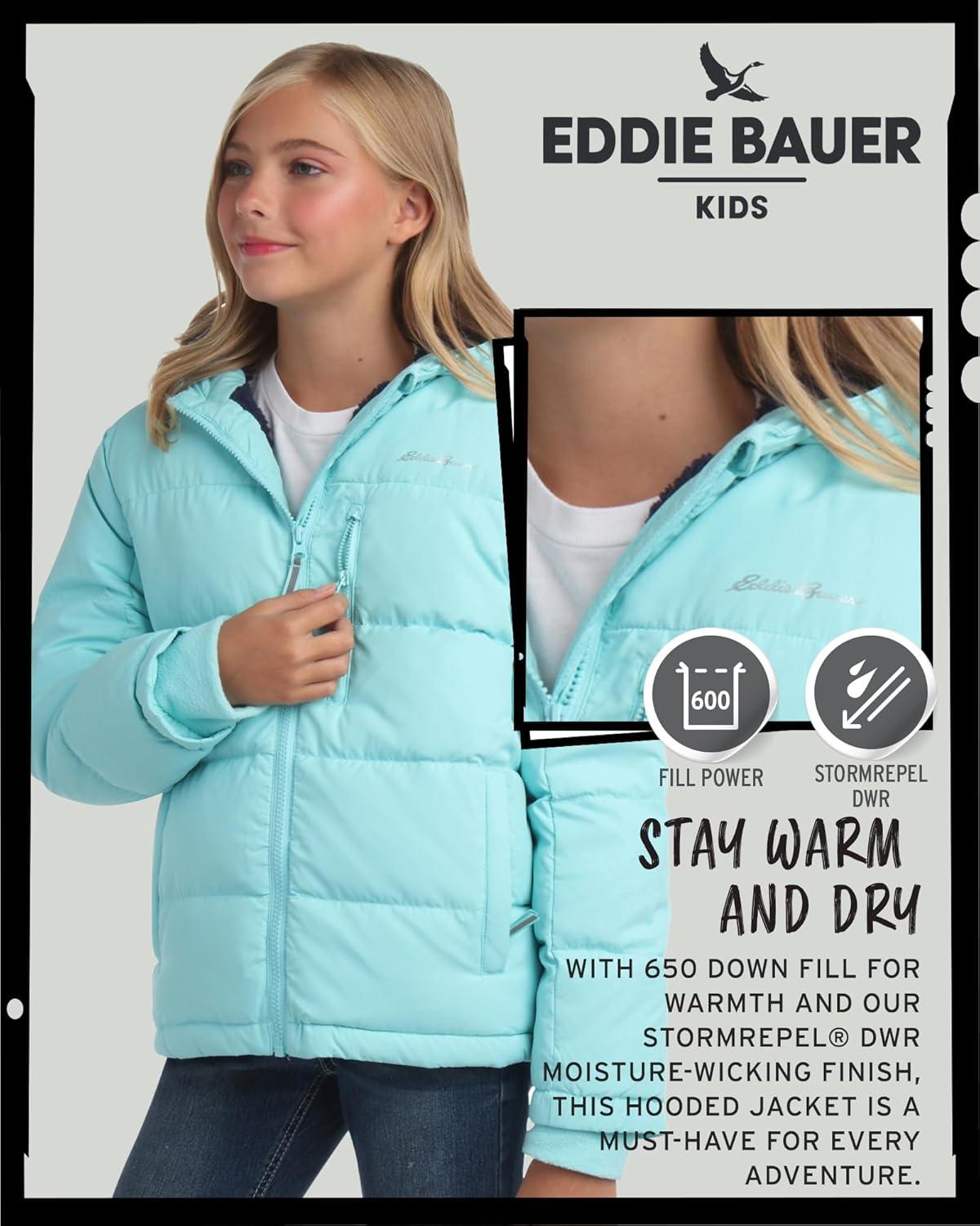 Prepare your kids for their next adventure with this officially licensed Eddie Bauer heavyweight down jacket. Designed to combine fashion and functionality, this quilted jacket is made with durable, high-quality fabric to withstand all their cold-weather activities. With a variety of stylish colors to choose from, you can find the perfect one to match your child's unique style. This is an ideal gift for any young explorer in your life. This durable jacket is made from wind and water-resistant fabric, ensuring your child stays comfortable and dry when the rain or snow starts to fall. It features deep hip pockets to keep their hands warm and a wide hood and large collar for extra protection against the elements. This versatile coat is perfect for everything from winter sports to casual school days. Stay warm without the extra bulk. This jacket features premium 650 fill power down insulation that is responsibly sourced and certified by the Responsible Down Standard (RDS). This provides superior warmth while keeping the coat incredibly lightweight, allowing for a full range of motion. The comfortable, insulated fit comes in a variety of sizes, so you can find the perfect one to keep your kids cozy all winter long.