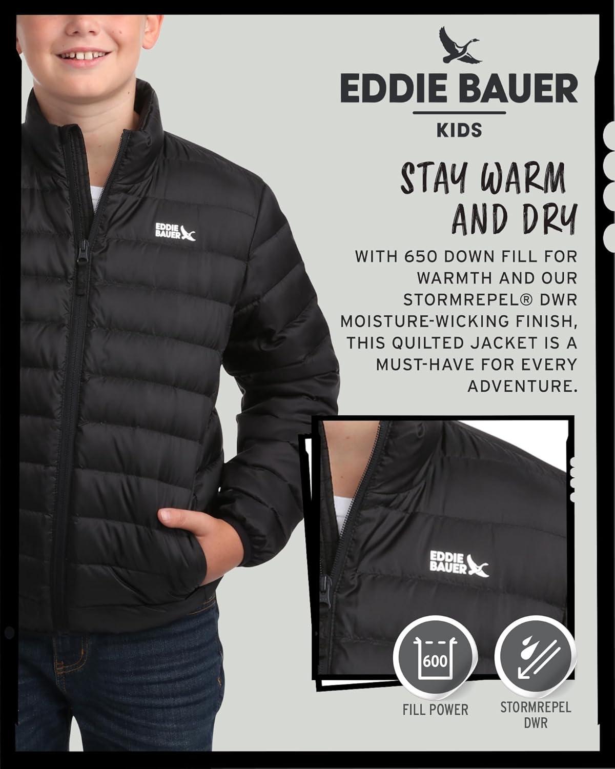 Dress your kids for adventure with the officially licensed Eddie Bauer Unisex Puffer Jacket. This isn't just a jacket; it's a testament to sustainable innovation. Made with recycled shell and lining, it offers exceptional warmth while minimizing environmental impact. The ultralight design and power down insulation provide the perfect balance of coziness and convenience, making this jacket incredibly easy to pack and perfect for every cold-weather adventure. Stay toasty in any weather with this versatile, high-performance puffer. Designed with a higher neckline to trap heat, this hoodless jacket ensures supreme warmth and comfort. It's the ideal choice for a wide range of activities, from a brisk morning hike to a day out in chilly winds. The StormRepel DWR finish repels moisture, keeping light rain and snow at bay, while secure side pockets provide a safe place for essentials. This durable, weather-resistant jacket is built to handle it all. This timeless piece offers a versatile fit that's just right for both boys and girls. The classic cut is designed to accommodate midweight layers without feeling too bulky, providing a perfect fit for a wide range of body types. Whether they're exploring the great outdoors or just heading to school, this down jacket provides the perfect blend of style, warmth, and practicality. It's the go-to jacket for any kid who loves to stay comfortable and stylish on the go.