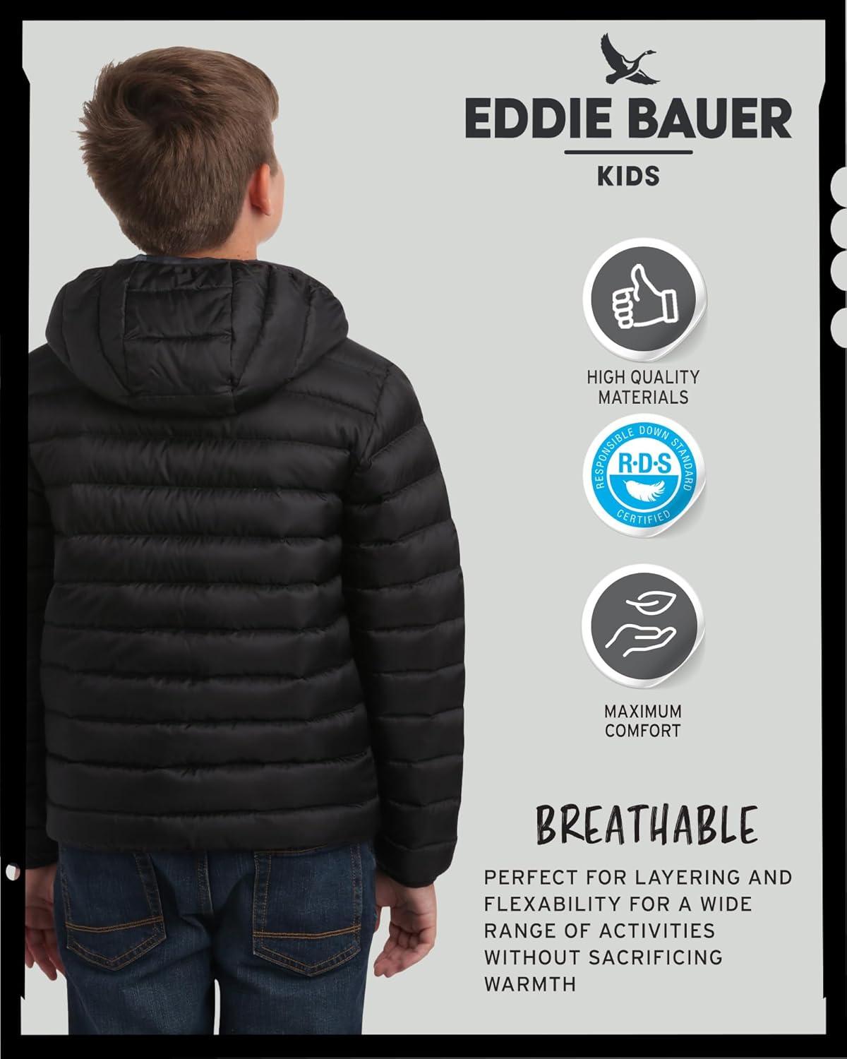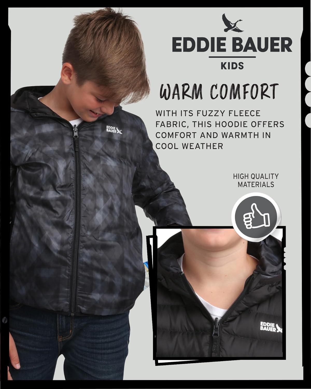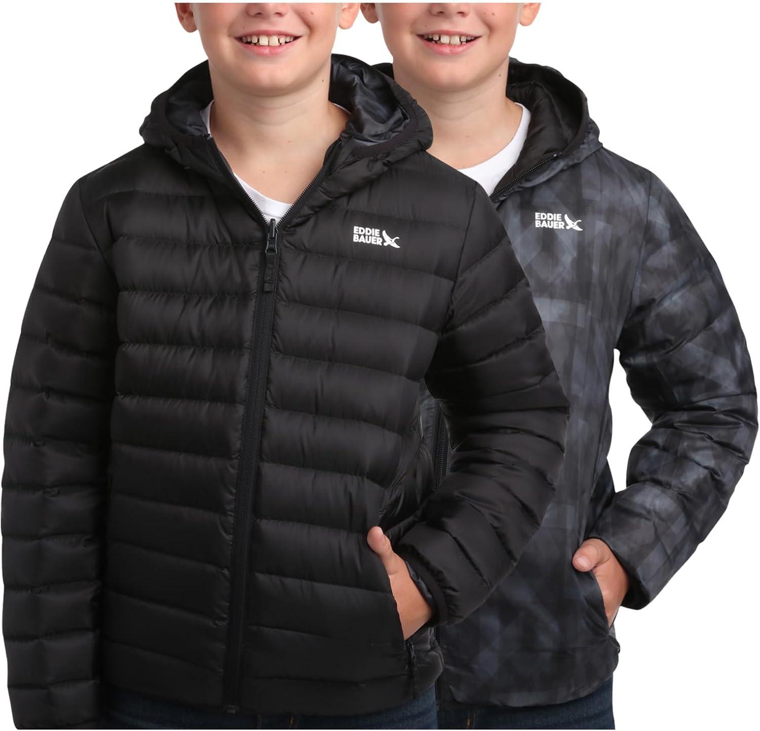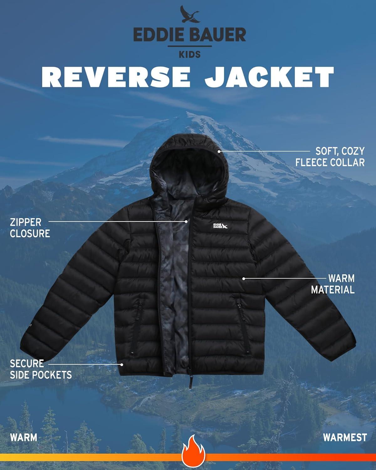 The officially licensed Eddie Bauer reversible puffer jacket is a must-have for any active kid. Designed for versatility and comfort, this jacket features a StormRepel finish that causes moisture to bead and roll off, ensuring your child stays dry in changing weather. With a quilted puffer on one side and a windbreaker raincoat on the other, it's the perfect solution for staying warm and dry without being weighed down. Whether they're headed to school or playing outside, this lightweight jacket offers reliable protection from the elements. This reversible jacket is designed with a 650 fill power down, offering superior warmth and insulation without the bulk. The lightweight design provides a comfortable fit that allows for easy movement, making it ideal for a variety of activities, from winter sports to everyday casual wear. Deep hip pockets keep hands warm and securely store small essentials, while the snug fit ensures your little one stays cozy. Available in a variety of sizes and classic colors like blue, grey, camo, and black, this waterproof jacket is a great gift for any child. Its durability and practical design make it an essential addition to any kid's wardrobe, providing a perfect blend of style, comfort, and protection. Give the gift of warmth and adventure with the Eddie Bauer reversible jacket.