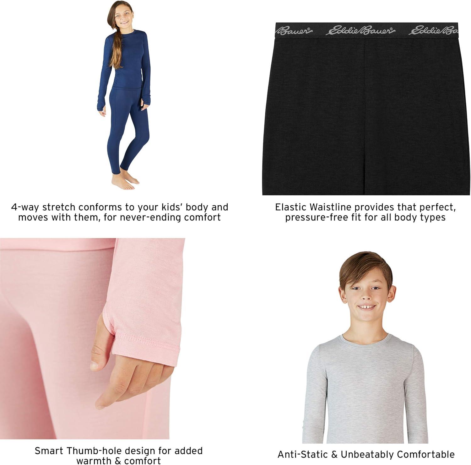 Invest in an Eddie Bauer Thermal Underwear Set & Grant Your Kid the Comfort & Warmth They Need Even During the Coldest DaysAsk anyone accustomed to living in a cold climate what the secret to staying warm is, and you'll invariably get one answer layeringEspecially if your little ones love skiing, snowboarding or any other amazing winter sport, keeping them warm and protected against the cold is the #1 thingWith this base layer thermal underwear set with long sleeved shirt and pants, you can finally be sure your young explorers will be covered from head to toe with the most protective and comfortable cold defying clothesPremium Kids' Layering 2 Piece Set The Best Thermal Underwear for Active Boys & GirlsWhether at home, at school, at playdates, or even at sports and activities, these cold weather base layer underwear garments are the perfect way to keep any child warm, dry and comfortableNot only do the long sleeved shirt and pants retain heat and add a layer of insulation to your kid's clothing, but they also allow free movement, wick sweat and moisture away, and dry very quickly!Designed & Made From the Ground Up for Children & Their Everyday Active LivesWarm, quick dry & heat retention, ideal even for the coldest daysAnti static, 4 way stretch fabric for unlimited movement 24/73 Needle coverlock stitch seams & hems for increased durabilityStretchy elastic waistband for perfect customized fitThumb hole design prevents the sleeves from rolling up37% Acrylic/34% polyester/25% rayon/4% spandex 120 GSMEddie Bauer 100 Years of Activewear History You Can Put Your Faith InKeep Your Kid Warm, Comfortable & Well Shielded Against Cold the Smart Way