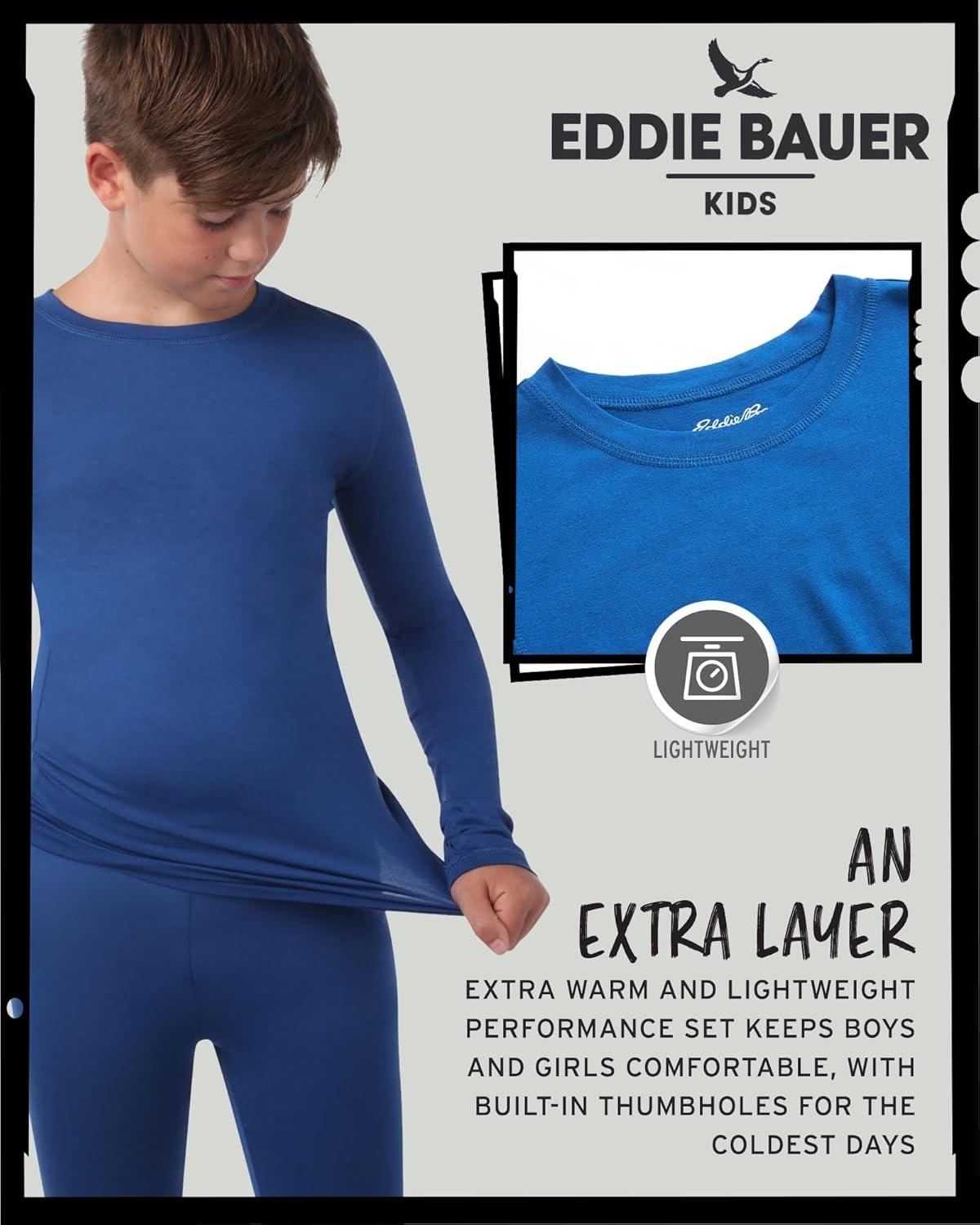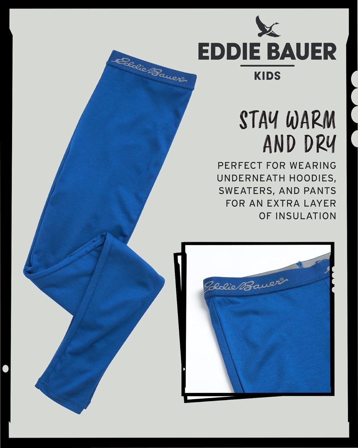 Keep your child warm and comfortable in cold weather with this kids thermals top and bottom set from Eddie Bauer. Designed as a high-performance kids base layer set, it provides an extra layer of insulation, making it the perfect ski base layer for winter adventures. The thermal underwear for kids includes a base layer shirt and thermal pants for kids, both crafted with 4-way stretch fabric to allow for a full range of motion. The kids thermal base layer features a lightweight, moisture-wicking design that ensures quick dry & heat retention, keeping your child warm without overheating. The anti-static technology prevents uncomfortable cling, while the elastic waistband on the thermal leggings provides a secure fit. The thumb-hole design in the base layer top keeps sleeves in place for added warmth. Perfect for layering under hoodies, sweaters, and pants, this kids thermal set offers fleece base layer kids need to stay cozy during outdoor play, skiing, or everyday wear. The 3-needle coverlock stitching enhances durability, making this long underwear kids set an essential piece of kids base layers cold weather wardrobes. Whether worn as kids long johns or warmers for kids, this kids thermal underwear set is built to perform.
