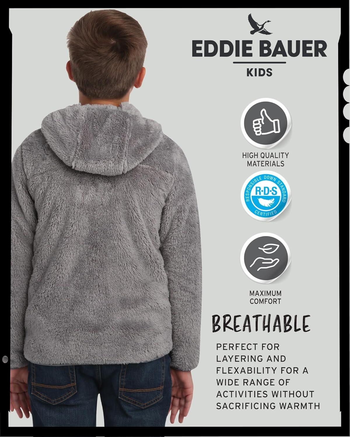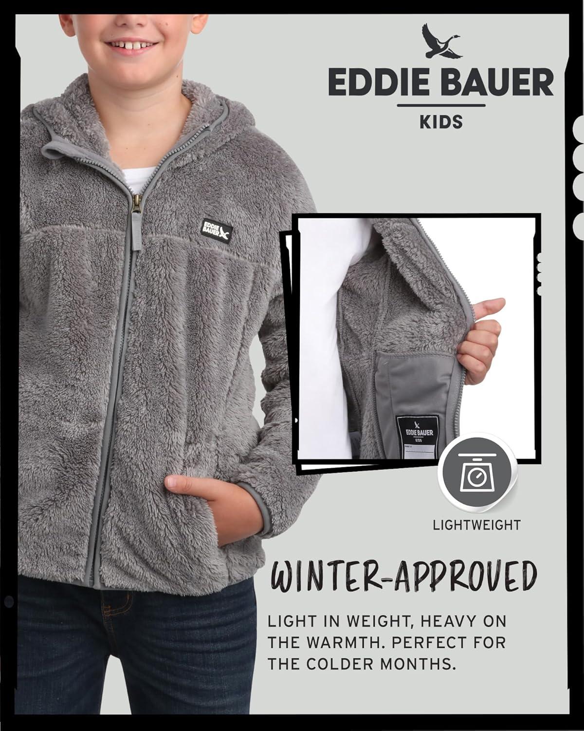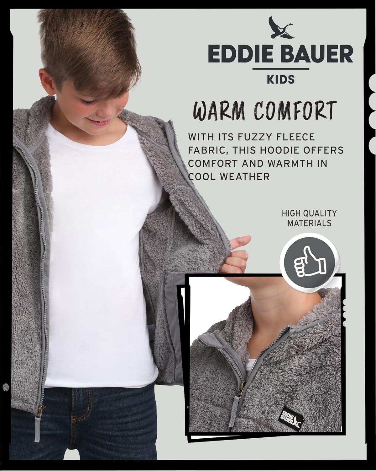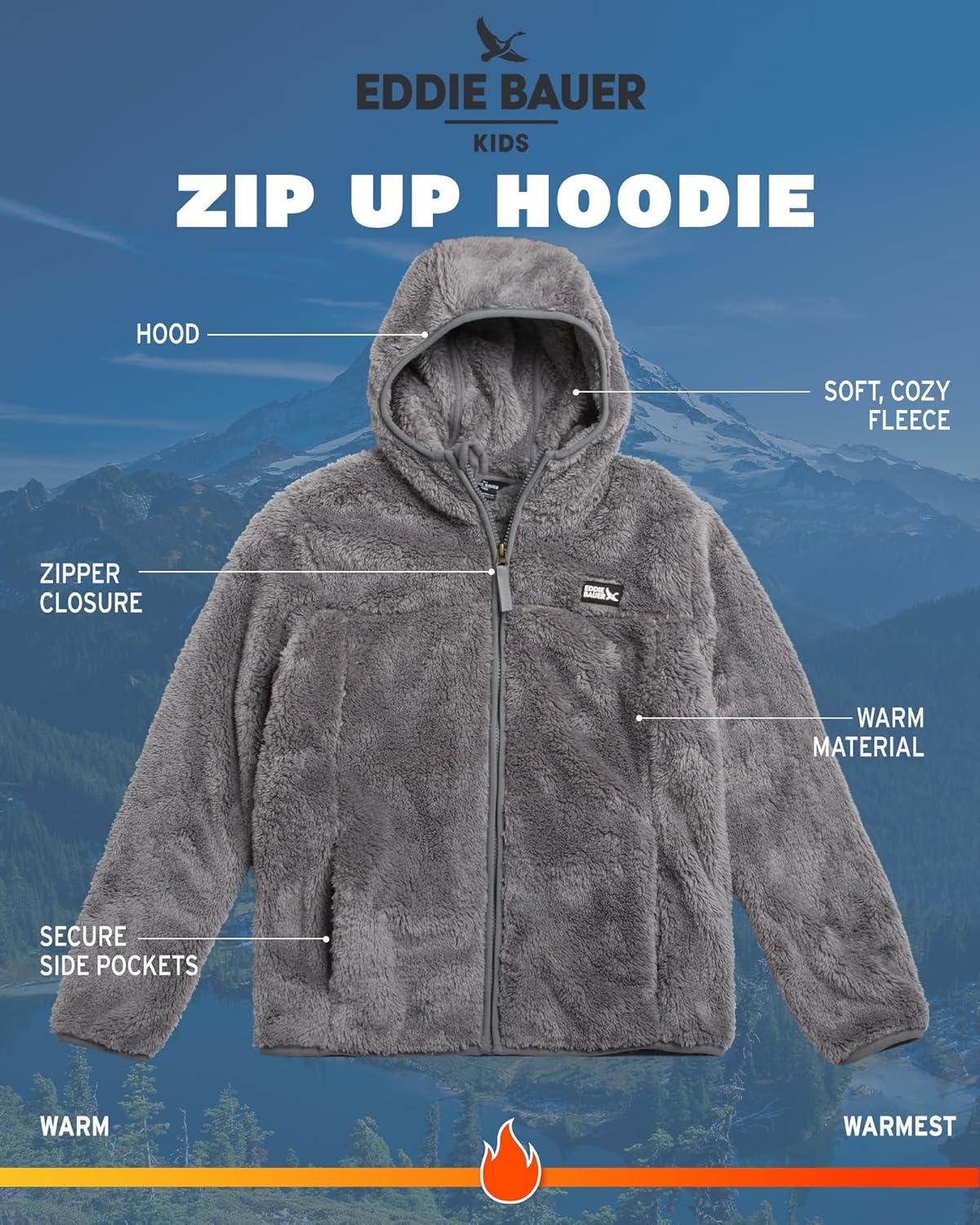 Officially licensed by Eddie Bauer, this cozy sherpa fleece zip-up hoodie is a must-have for boys and girls. Made from super soft and smooth fabric, this sweatshirt is perfect for chilly autumn and winter days, whether they're at school, the park, or just lounging at home. With its high-quality design and a variety of stylish colors to choose from, this hoodie is a versatile and trendy addition to any child's wardrobe. This durable sweatshirt is built to last, so your active boy or girl can enjoy it on all their adventures. The full-zip design makes it easy to layer over their favorite tees, while the plush sherpa fleece ensures they stay warm and comfortable. With a wide range of fun colors to choose from, you can find the perfect one to complement their everyday look and let them show off their unique style. Eddie Bauer combines its adventure-driven innovation with a commitment to sustainability and inclusivity. This sweatshirt reflects their dedication to using materials and methods that minimize impact, all while building an outdoor culture that is open to everyone. Give the gift of warmth and style with this super soft Eddie Bauer hoodie—a perfect present for sons, daughters, grandsons, granddaughters, and all the kids in your life.