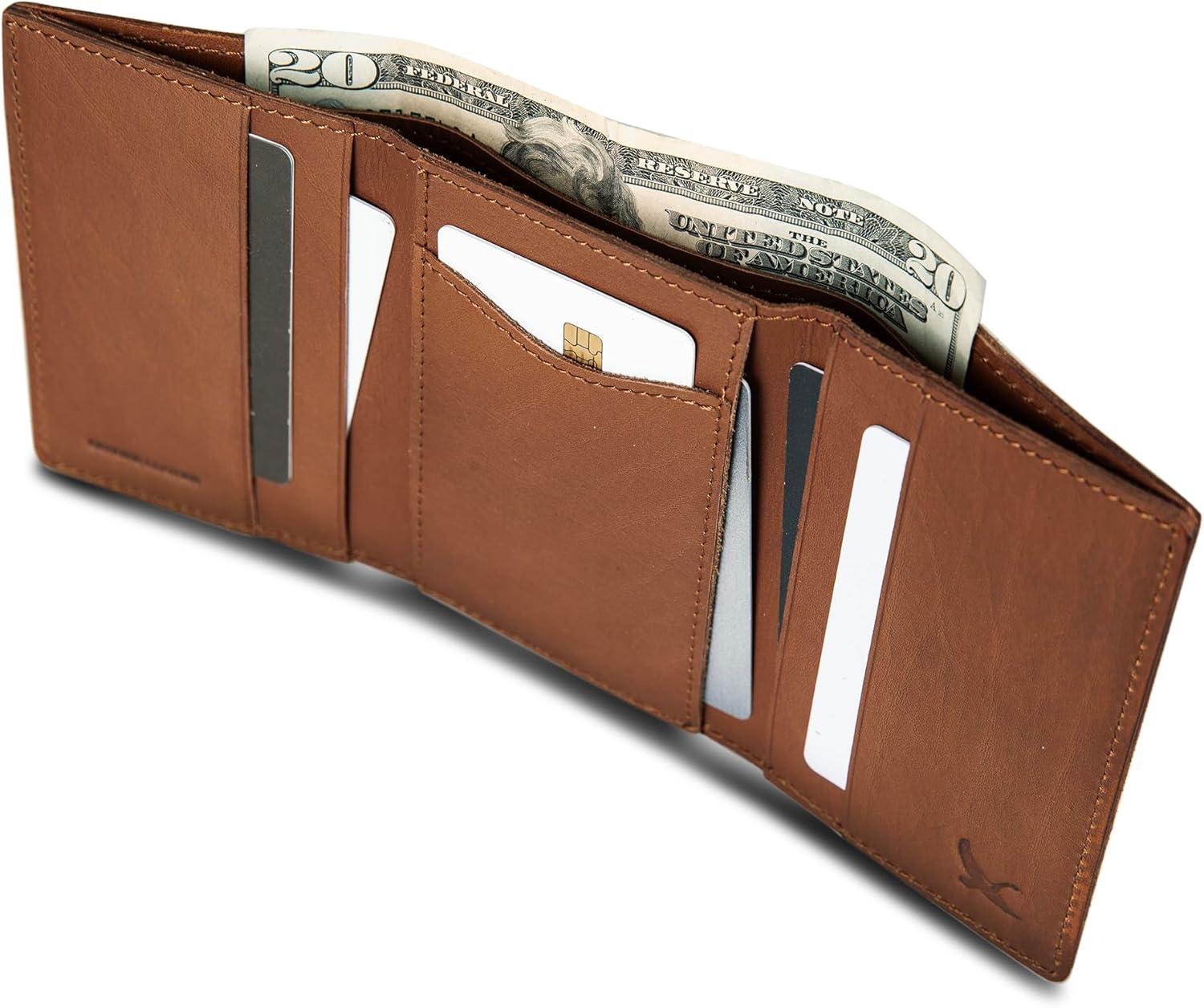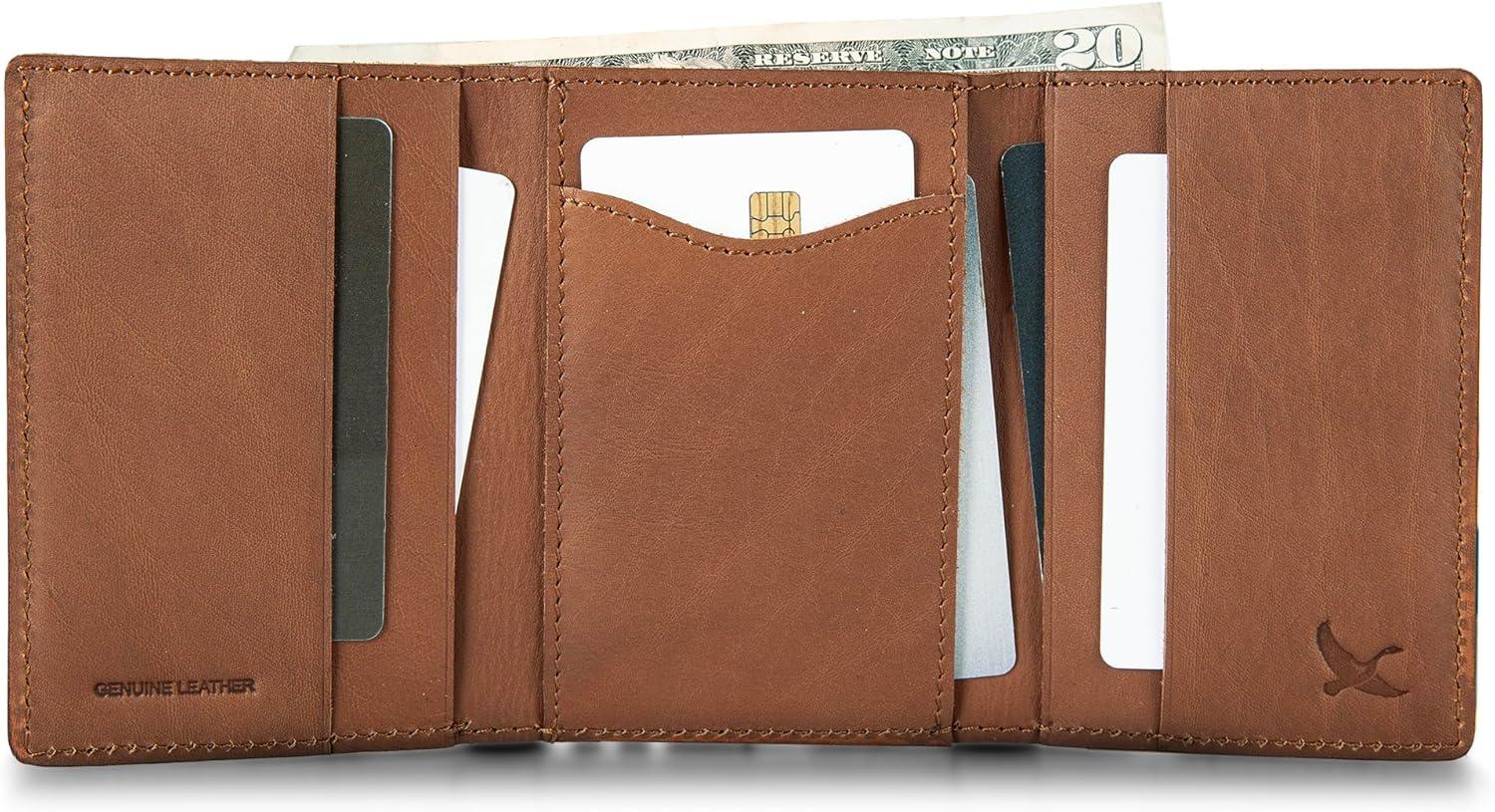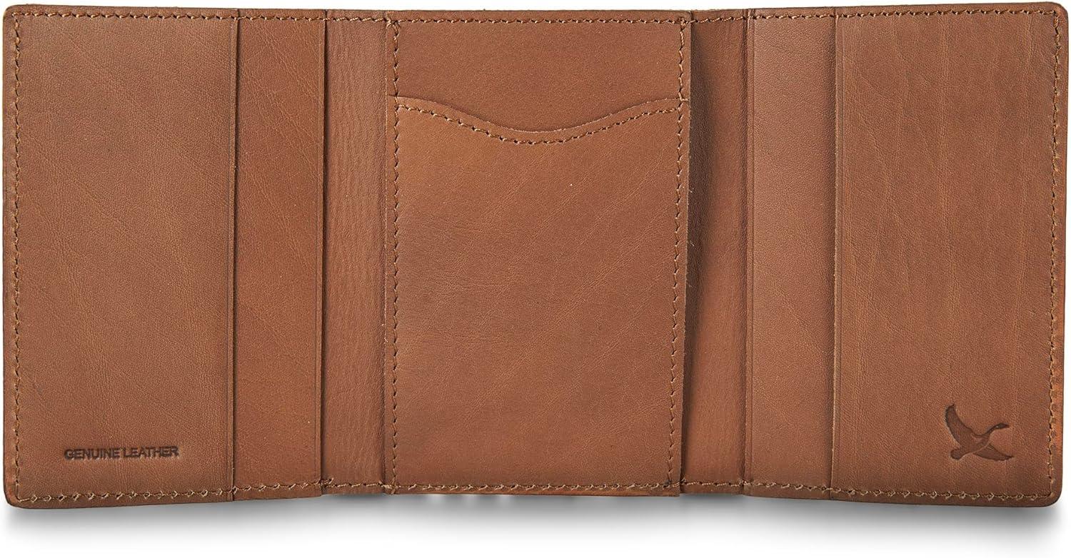 This genuine leather wallet is stamped with the Signature Eddie Bauer logo. The trifold design is created with six card slots and two slip pockets with an additional easy to access clear ID window. Additional storage options for cash included. RFID Identity Theft Protection is also built into the wallet to prevent information theft and give you peace of mind. Available in both Brown and Tan Leather options.