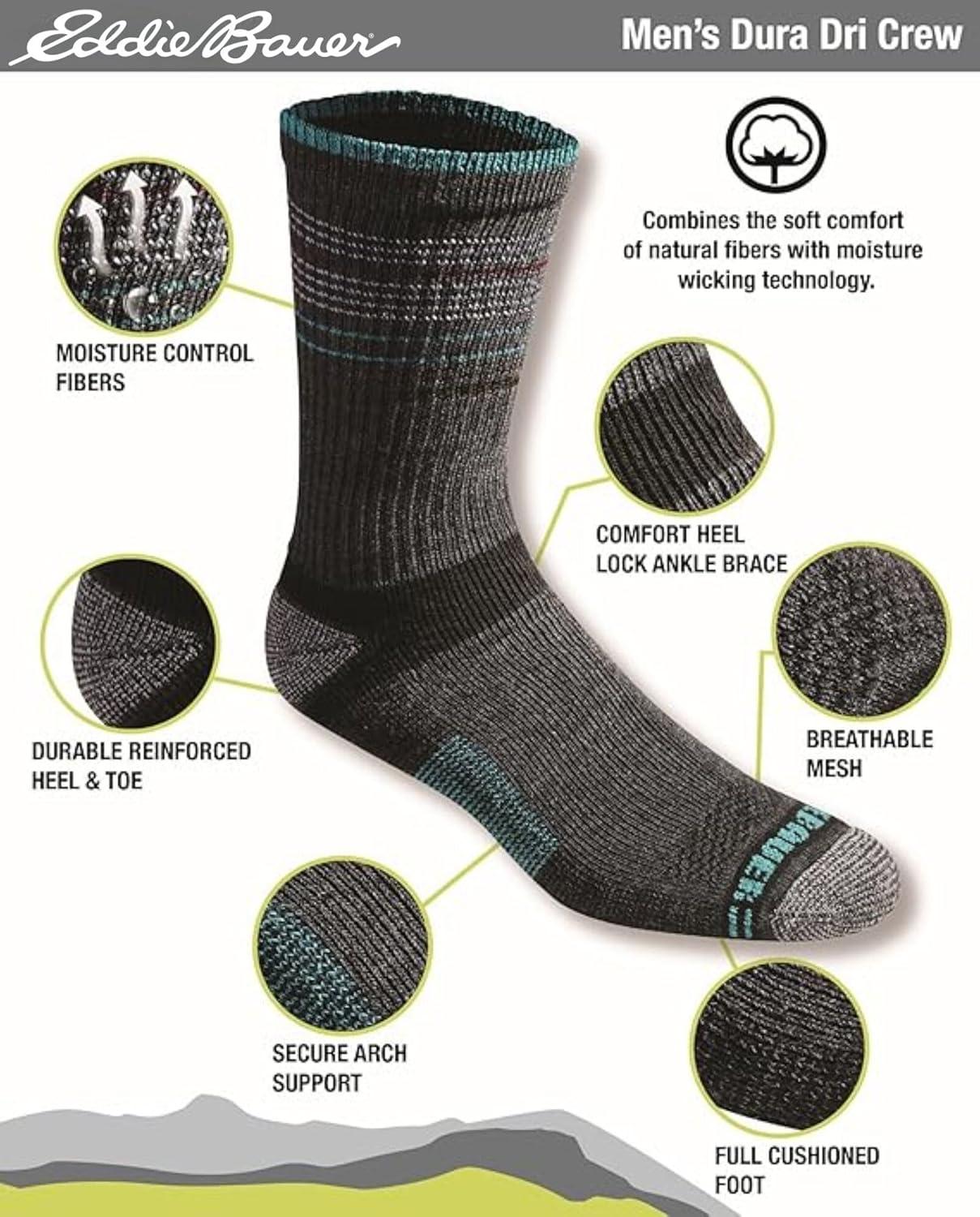 Eddie Bauer Men’s Dura Dri Moisture Control Crew Socks, 6 Or 12 Pairs(Fashion Black Assorted (6 Pairs))