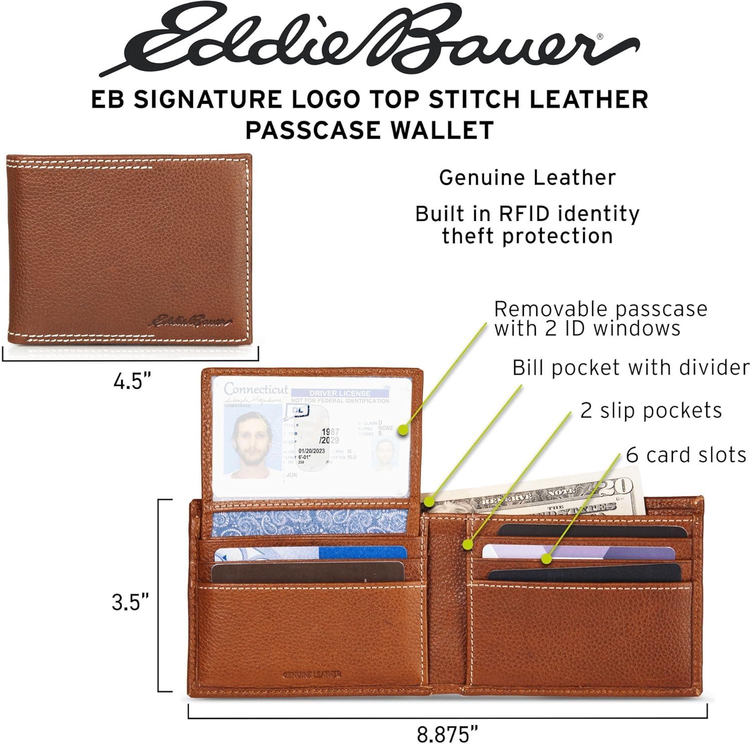 FEATURES & CAPACITIES: This passcase wallet is made of genuine leather and features top stitch detailing along with the Signature Eddie Bauer logo. It has a bifold design with six card slots and two slip pockets, as well as a removable passcase with two clear ID thumb slide windows.