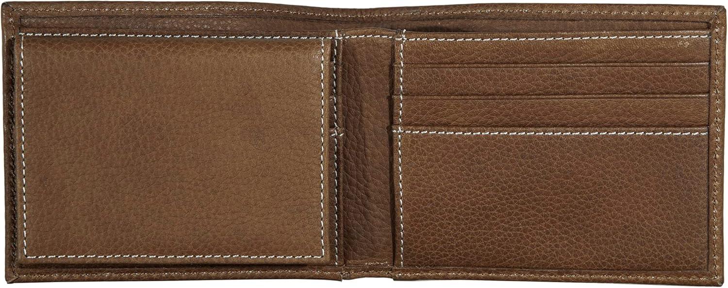 This top stitch, genuine leather passcase wallet is stamped with the Signature Eddie Bauer logo. The bifold design is created with six card slots and two slip pockets. Additionally, it comes with a Removable passcase that is equipped with two easy to access clear ID thumb slide window. Storage options for cash are included with a divider for optimal organization. RFID Identity Theft Protection is also built into the wallet to prevent information theft and give you peace of mind.