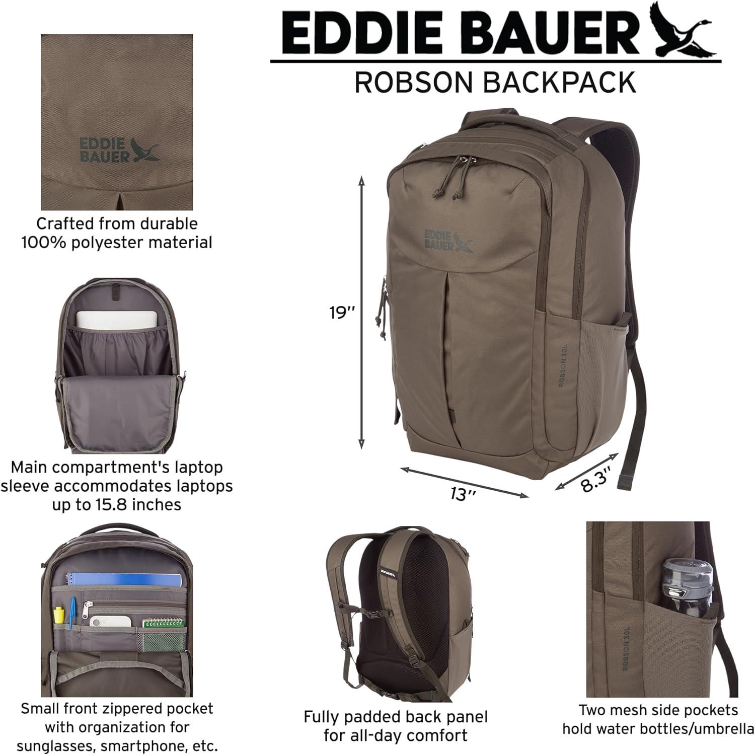 The Eddie Bauer Robson Backpack 27L blends functionality, sustainability, and modern design, making it the perfect choice for outdoor enthusiasts, s, and professionals alike. Made from 100% recycled polyester, this eco-conscious backpack ensures durability while reducing environmental impact. The spacious main compartment features a dedicated laptop sleeve for secure storage, along with a padded back panel for enhanced comfort. Two mesh side pockets provide quick access to water bottles or umbrellas, while the front zippered organizer pocket keeps your phone, sunglasses, and small essentials within easy reach. Whether you're hiking, heading to , commuting, or traveling, the Robson Backpack’s 27L capacity offers the perfect balance of organization, storage, and portability. Designed with Eddie Bauer’s commitment to quality and innovation, this lightweight, versatile backpack is built for any adventure. Product Dimensions: 8.25”L x 13.00”W x 19.00”H | Weight: 1.66 lbs.