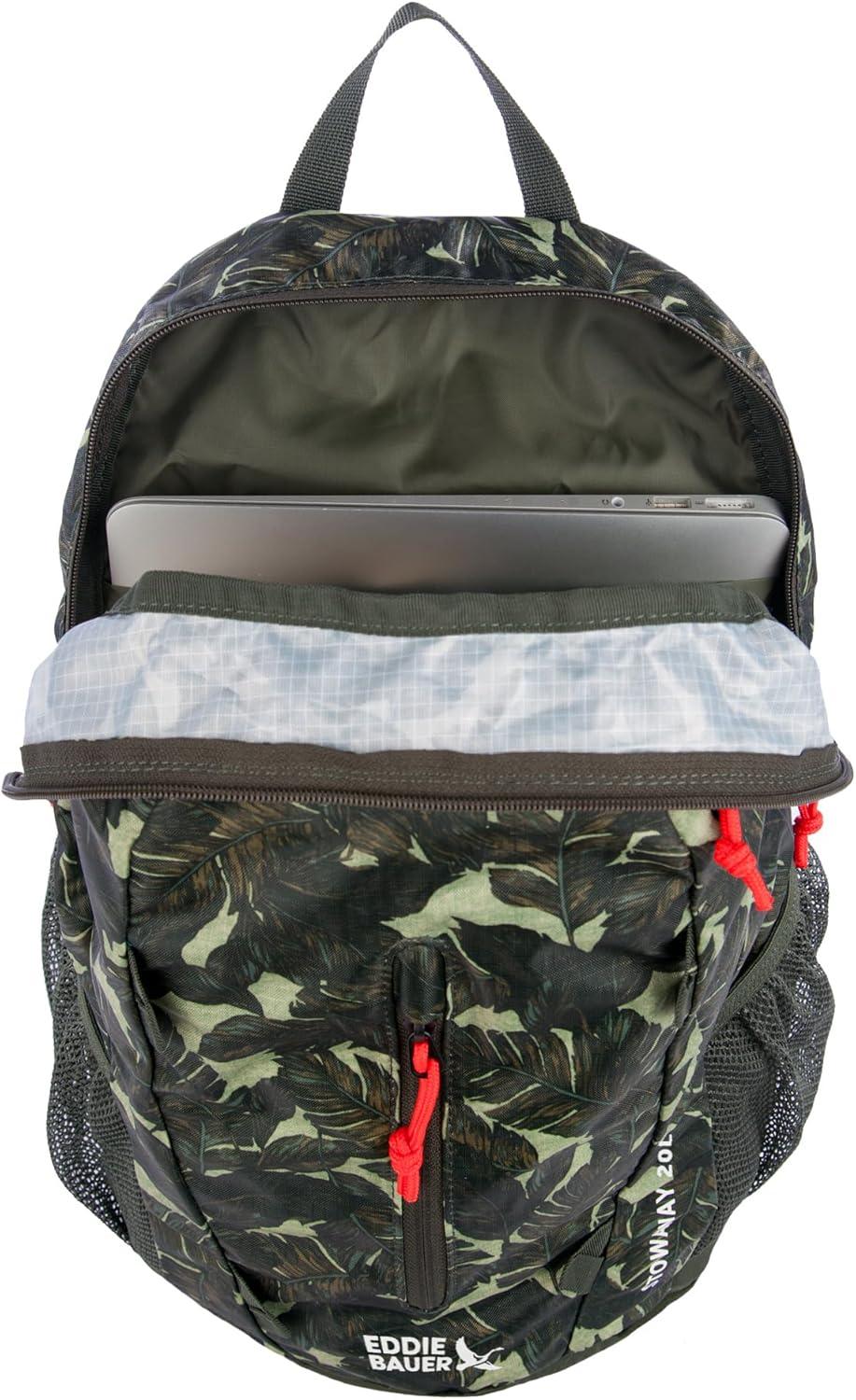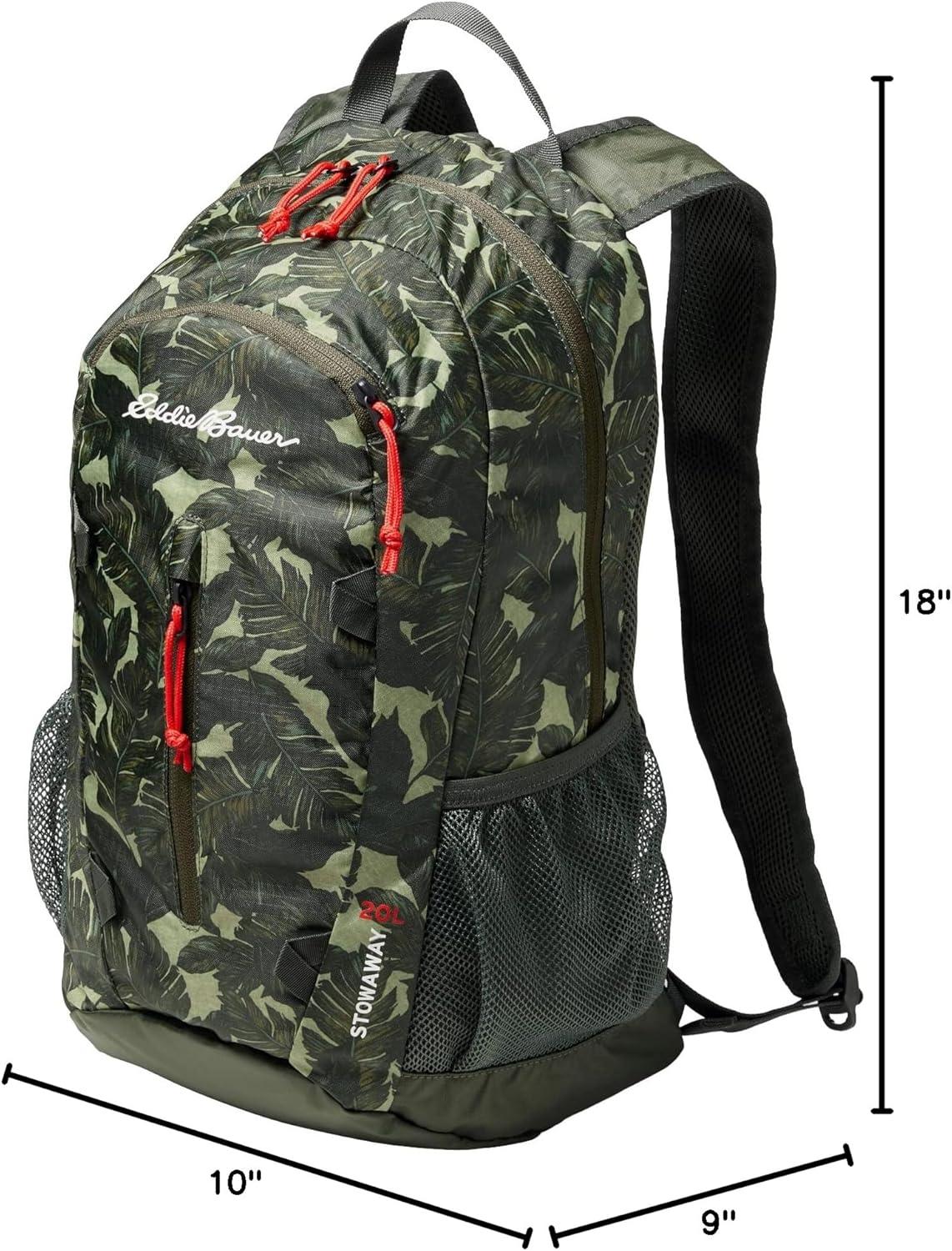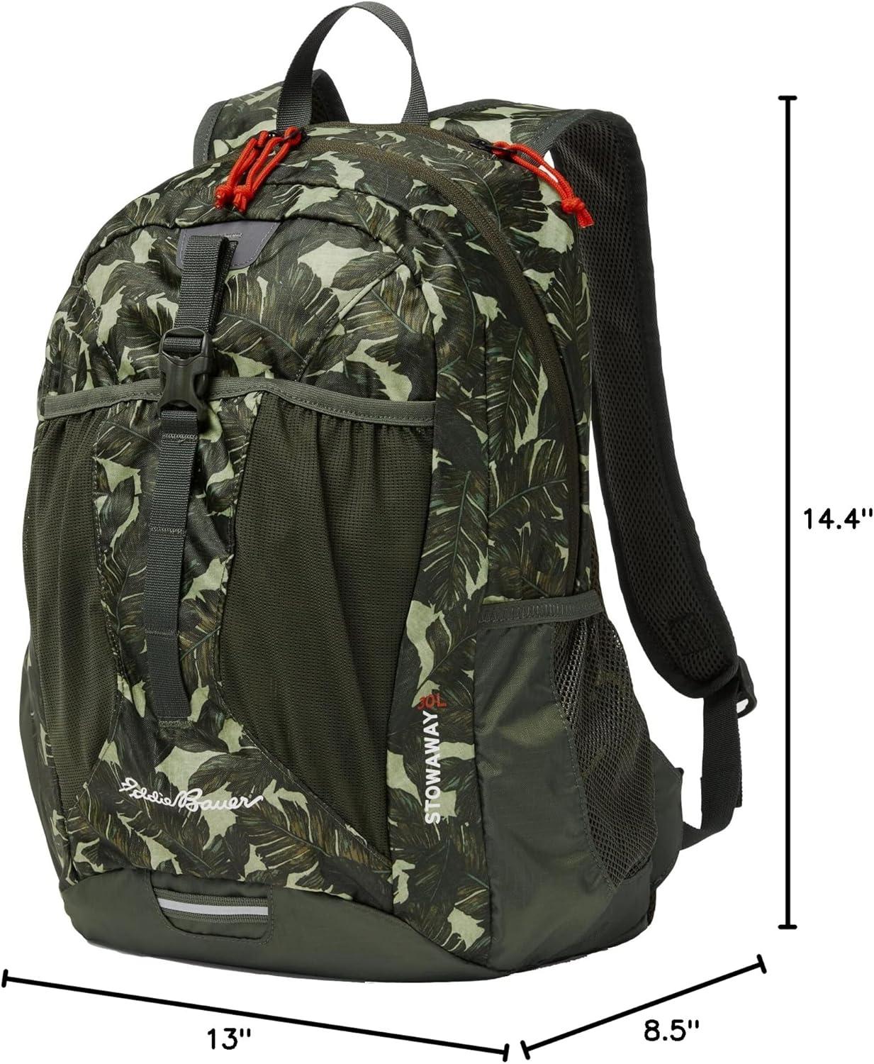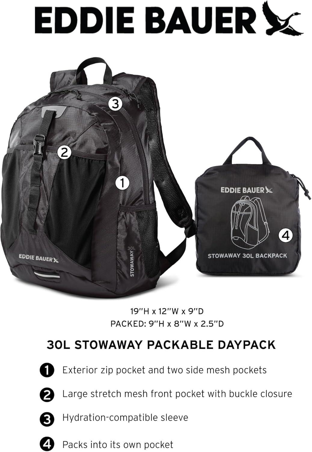 Eddie Bauer Stowaway Packable 30L Backpack Elevate your outdoor and travel adventures with the Eddie Bauer Stowaway Packable 30L Backpack. Lightweight yet durable, this versatile backpack is designed to offer exceptional comfort, functionality, and portability, making it your perfect companion for hiking, work, or daily use. Comfortable Design: The backpack features a mesh back panel and padded shoulder straps to ensure extended wear comfort. Its spacious interior includes a dedicated laptop sleeve and a hydration bladder portal for added convenience. Thoughtful Organization: With two mesh side pockets, you can keep water bottles or other essentials easily accessible. The main compartment provides ample space to organize your belongings, perfect for outdoor or urban settings. Compact Packability: When not in use, the backpack folds into its own pocket, measuring just 9″ x 8″ x 2.5″. This innovative design offers a space-saving solution for travel and storage. Weather-Resistant Durability: Crafted from ripstop polyester, this backpack features a StormRepel WR finish, shedding moisture to keep your gear dry and protected, even in wet conditions. Sustainability Meets Style: Eddie Bauer combines adventure-driven innovation with eco-conscious practices, ensuring a sustainable and inclusive approach to outdoor exploration. Dimensions & Capacity: Open dimensions: 19″ x 12″ x 9″. Volume: 30L. Lightweight at just 0.85 lbs, this backpack is ideal for carrying all your essentials with ease. Whether you’re trekking in the mountains, commuting in the city, or enjoying a weekend getaway, the Eddie Bauer Stowaway Packable 30L Backpack is your go-to solution for functionality, style, and convenience.