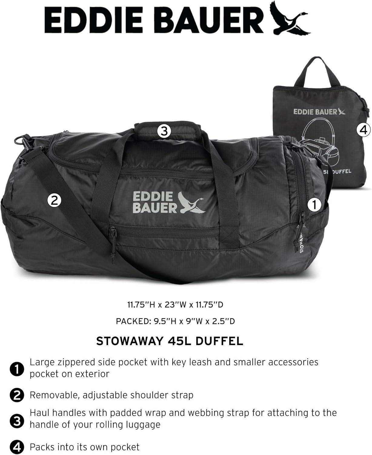 The Eddie Bauer Stowaway Packable 45L Duffel Bag is the ultimate travel companion, blending durability, functionality, and sustainability. Designed with the adventurous traveler in mind, this duffel features a spacious 45-liter capacity to easily store all your essentials, whether you're embarking on a weekend getaway, a family vacation, or an outdoor expedition. Crafted from 200-denier ripstop polyester with a StormRepel WR finish, this bag is built to withstand harsh conditions while keeping your belongings dry and secure. It includes thoughtful features like a zippered shoe garage to separate footwear and a trolley-handle sleeve for effortless attachment to rolling luggage. When not in use, the packable design allows the duffel to fold into its own 9.5″ x 9″ pocket, making it incredibly easy to store and carry. Eddie Bauer's dedication to sustainability is evident in its use of eco-conscious materials and methods, ensuring a minimal environmental footprint. Measuring 11.75″ x 23″ x 11.75″ (open) and weighing just 1.2 lbs, the Stowaway Duffel is perfect for travel, gym sessions, road trips, and outdoor adventures. Experience the perfect balance of innovation and style with Eddie Bauer.
