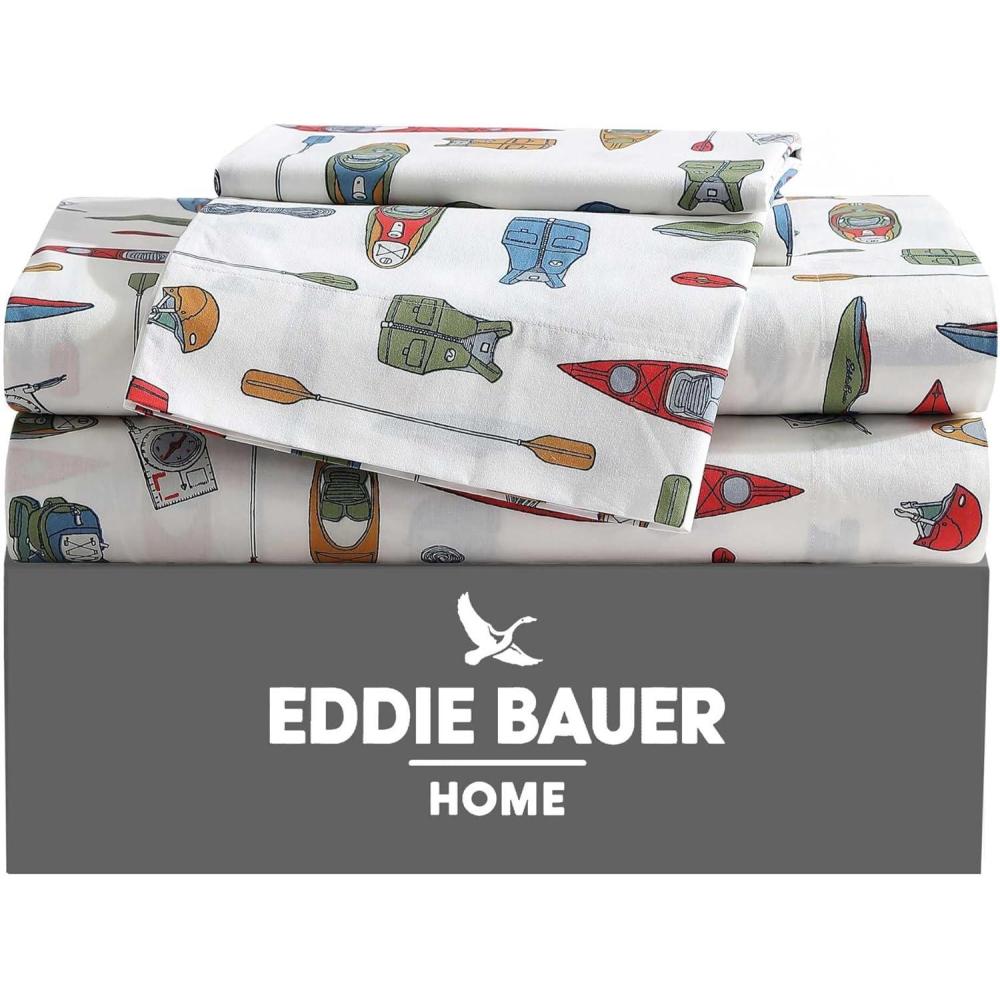 Eddie Bauer – Twin Sheet Set, Cotton Percale Bed Sheets, Crisp & Cool, Ideal Dorm Essentials (Canoe Lake Paddle White, Twin)(Kayak Adventure White)